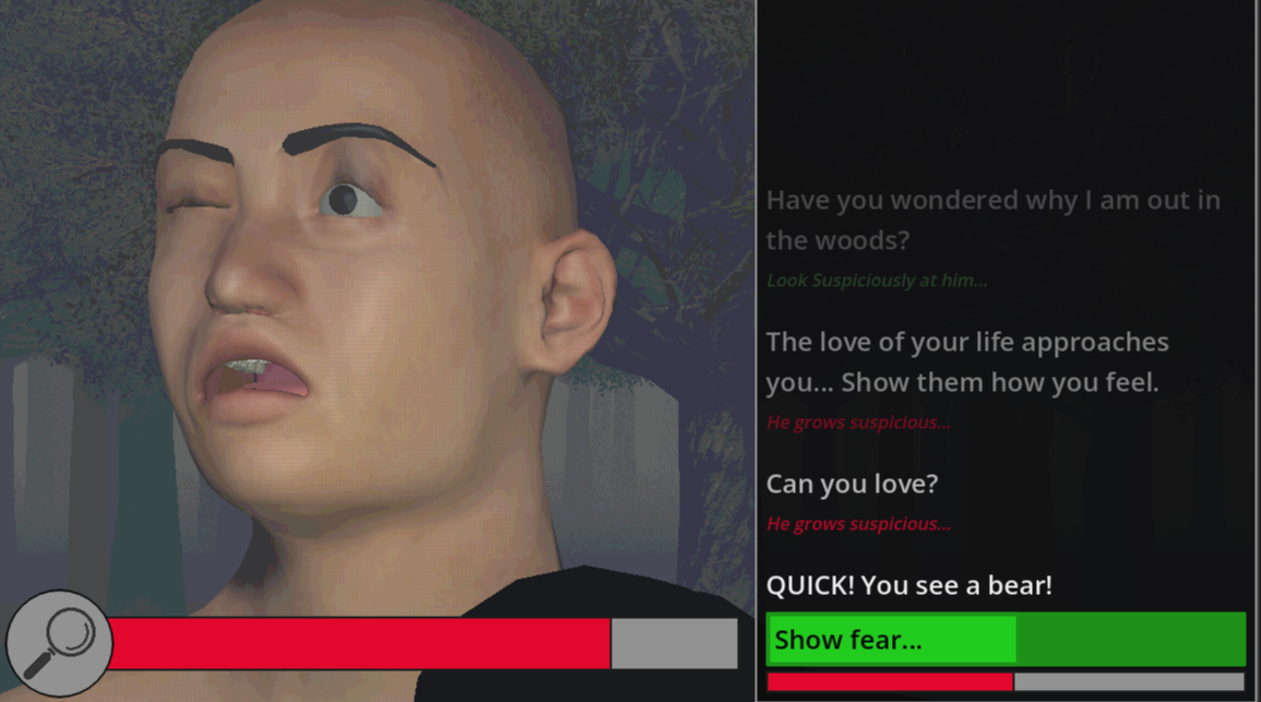 A stranger confronts you in the woods at night. Throw off their suspicions by being a regular human being. It may prove harder than expected...